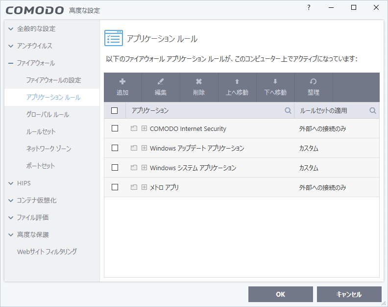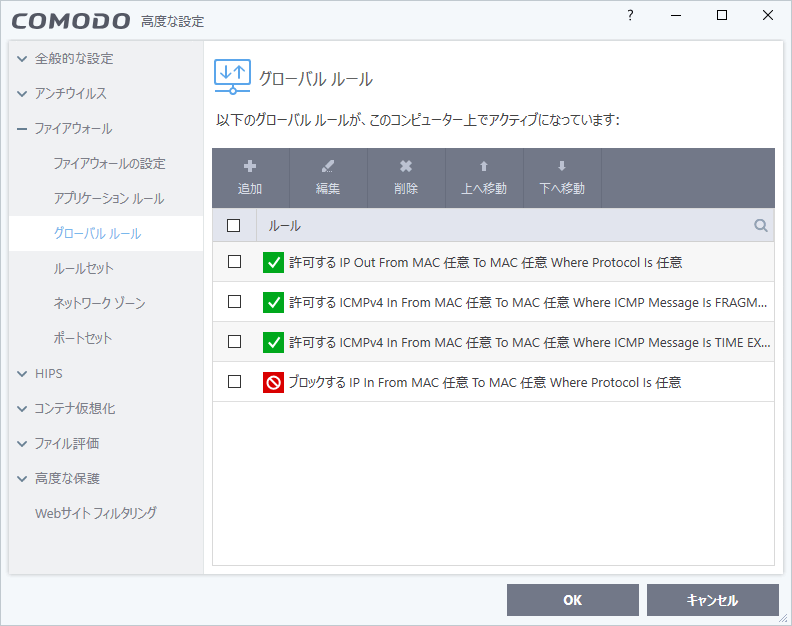 - グローバルルールを設定しても前項のアプリケーションルールによるフィルタリングは行われる