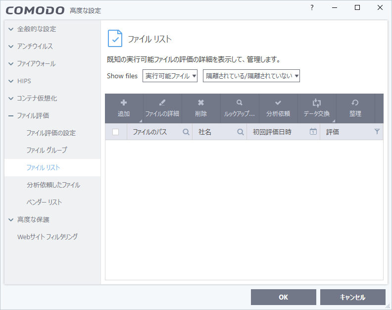 - ルールリストを入出力したい場合、ファイアウォールやHIPSのリストが「全般的な設定」→「環境構成」の設定ファイルに含まれているのに対し、ファイル評価のリストは独立しているためこの画面の「データ交換」で行う必要がある。