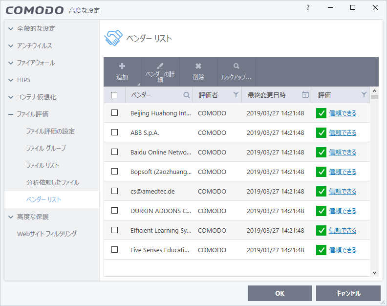 Comodo再インストールの際は、インストール後まずベンダーリストを一括ですべて消してから[ファイル リスト]ファイルをインポートすることで、不要なベンダーの削除作業を再度行わなくて済む。